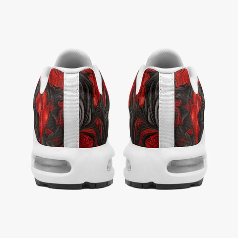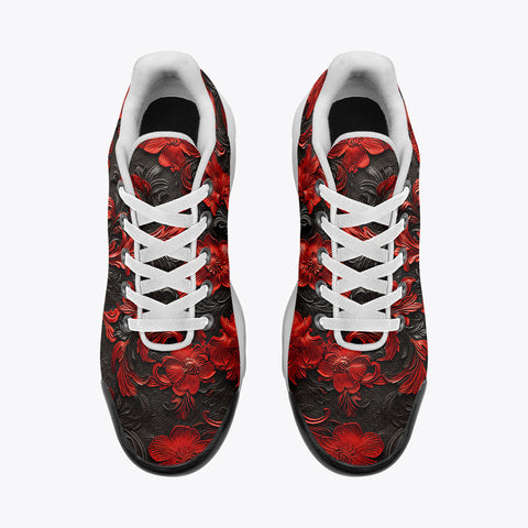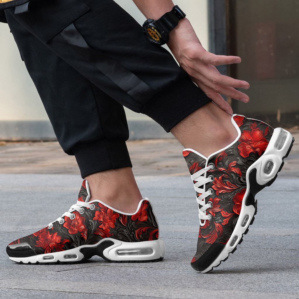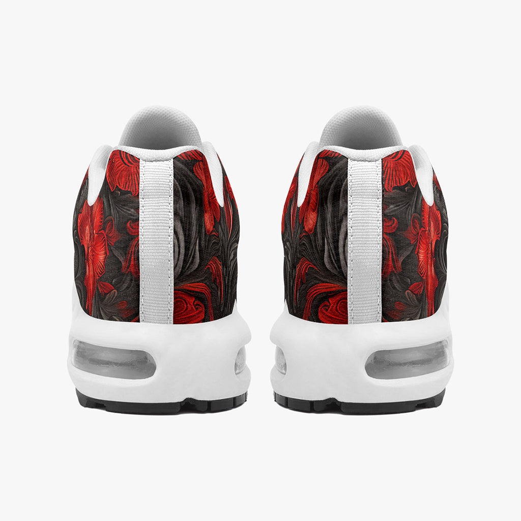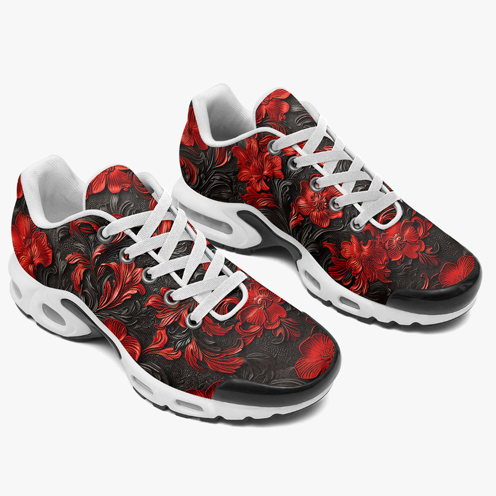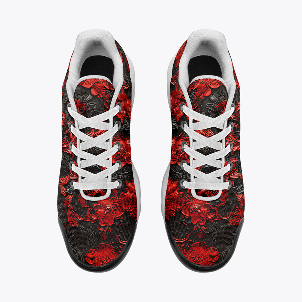 Air Cushion Sneakers Red Engraved Flowers on Black