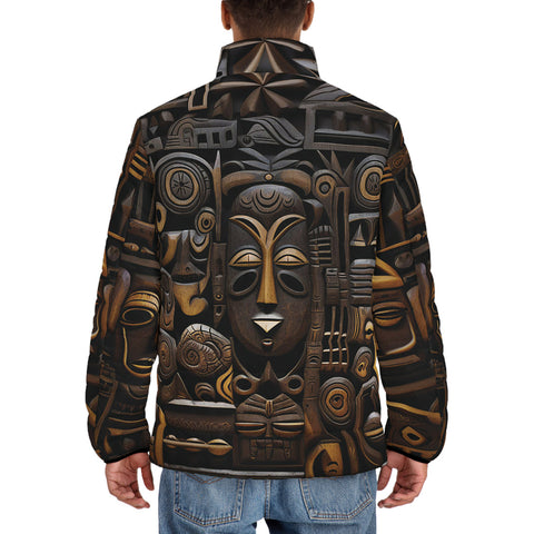 Down-Padded Puffer Jacket African Wooden Masks Carvings
