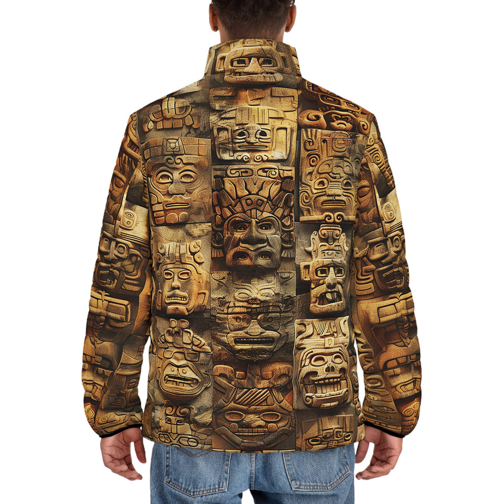 Down-Padded Puffer Jacket Ancient Mayan Carvings Faces