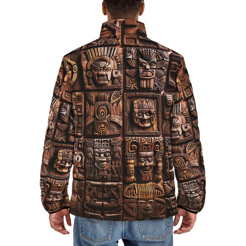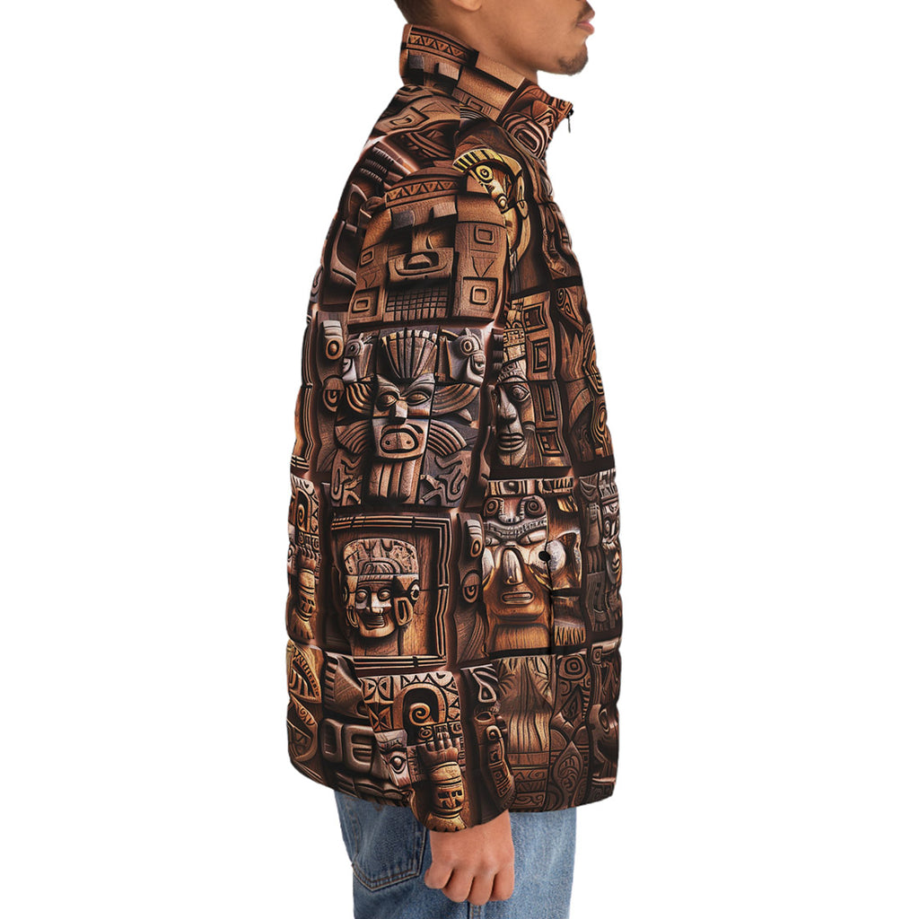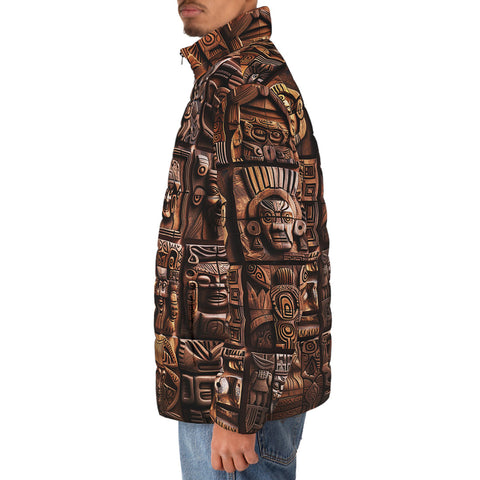 Down-Padded Puffer Jacket Ancient Mayan Wooden Carvings