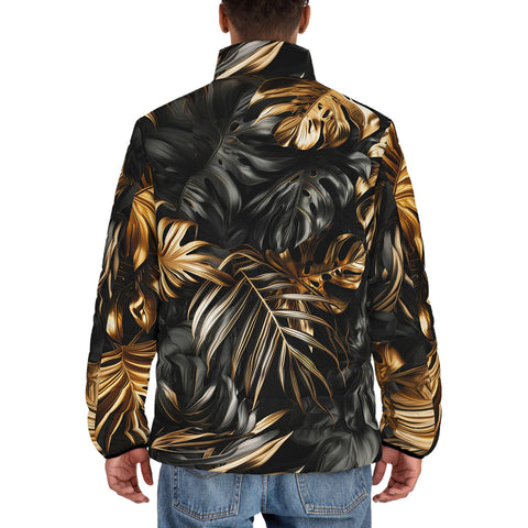 Down-Padded Puffer Jacket Black and Gold Tropical Leaves