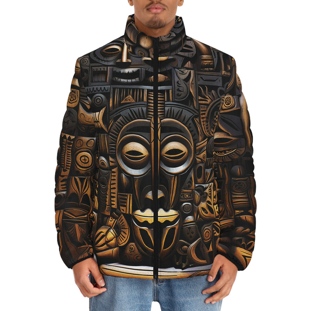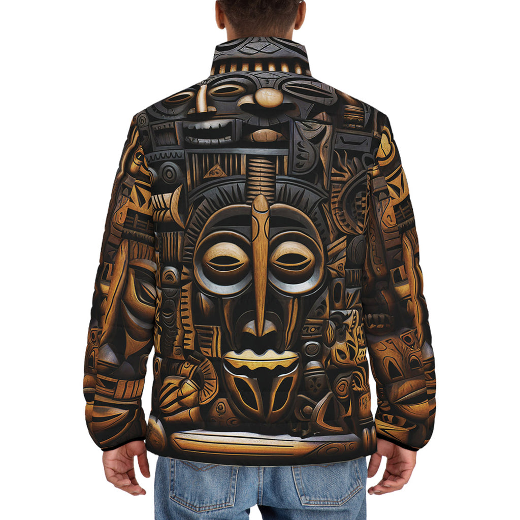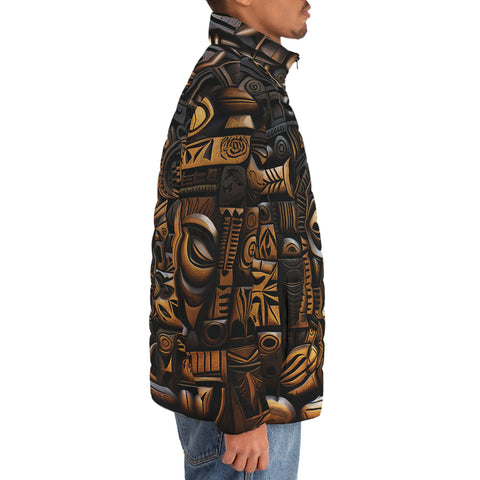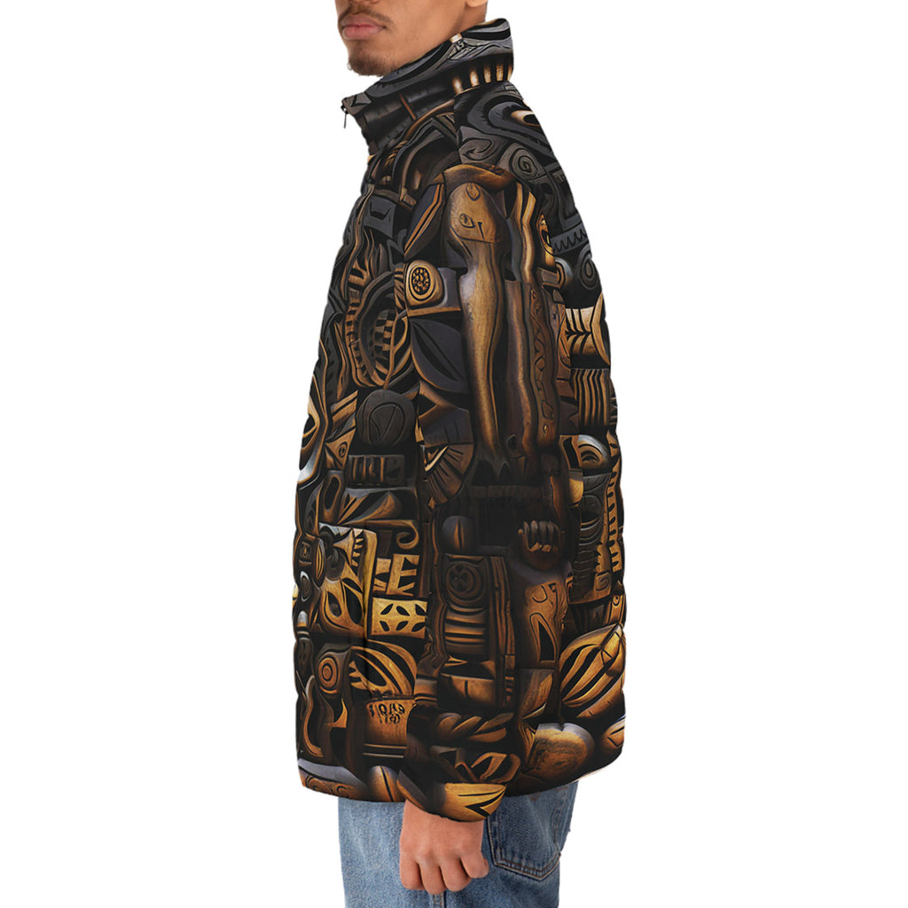 Down-Padded Puffer Jacket Carved Wood African Patterns
