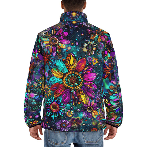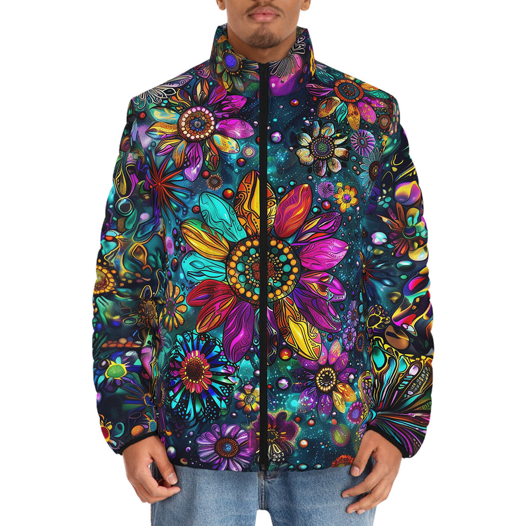 Down-Padded Puffer Jacket Colorful Psychedelic Flower and Gemstones