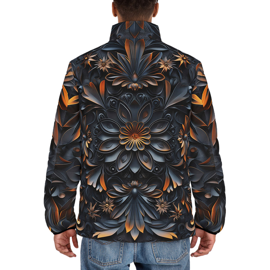 Down-Padded Puffer Jacket Gothic Pattern Carved Wood and Copper