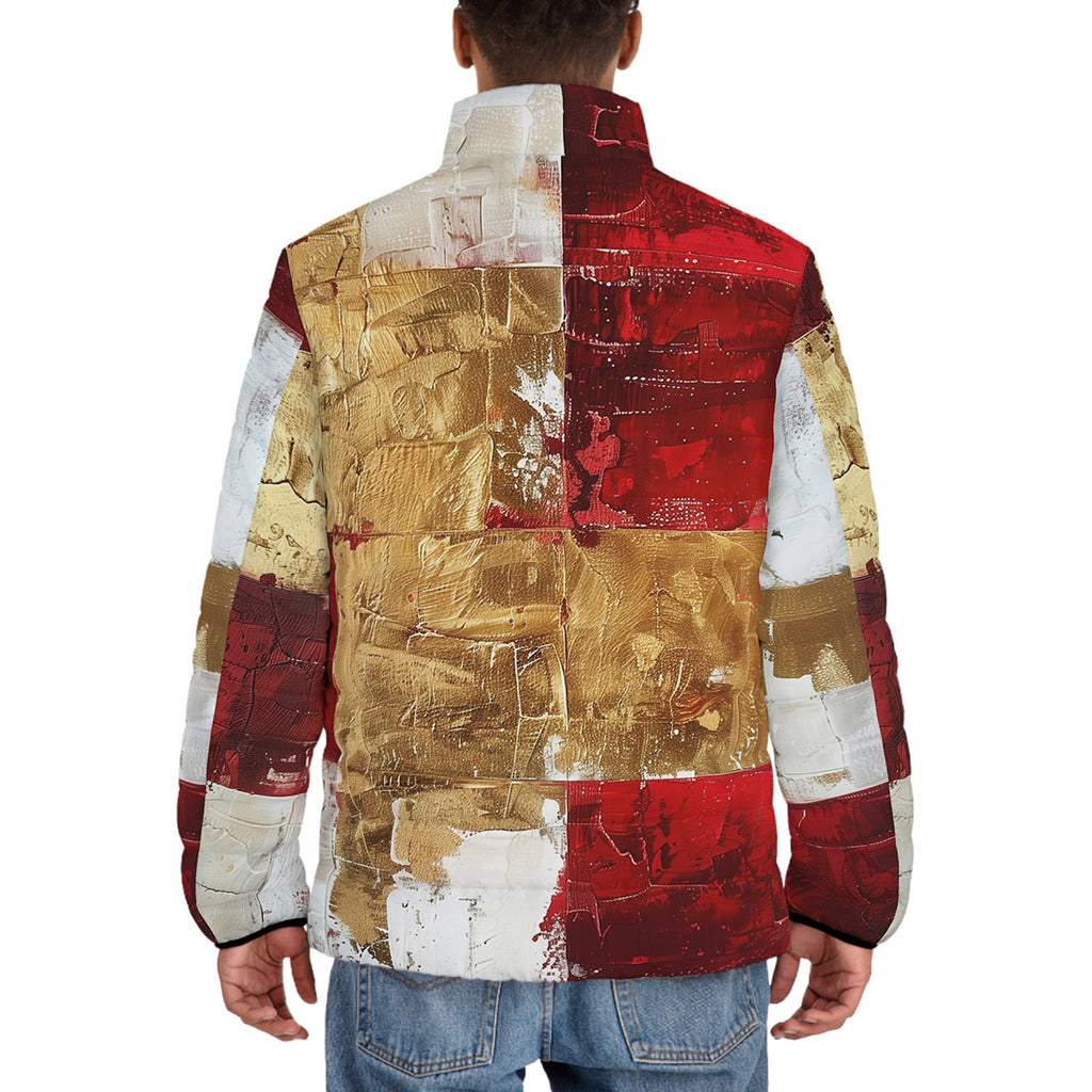 Down-Padded Puffer Jacket Modern Art Abstraction White Yellow and Red