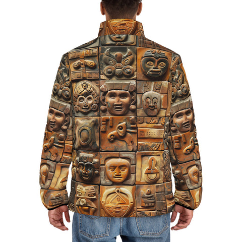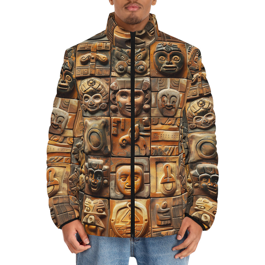 Down-Padded Puffer Jacket Terracotta Tiles Carvings Faces
