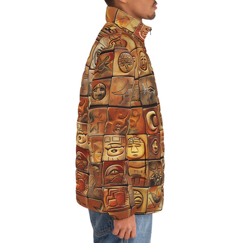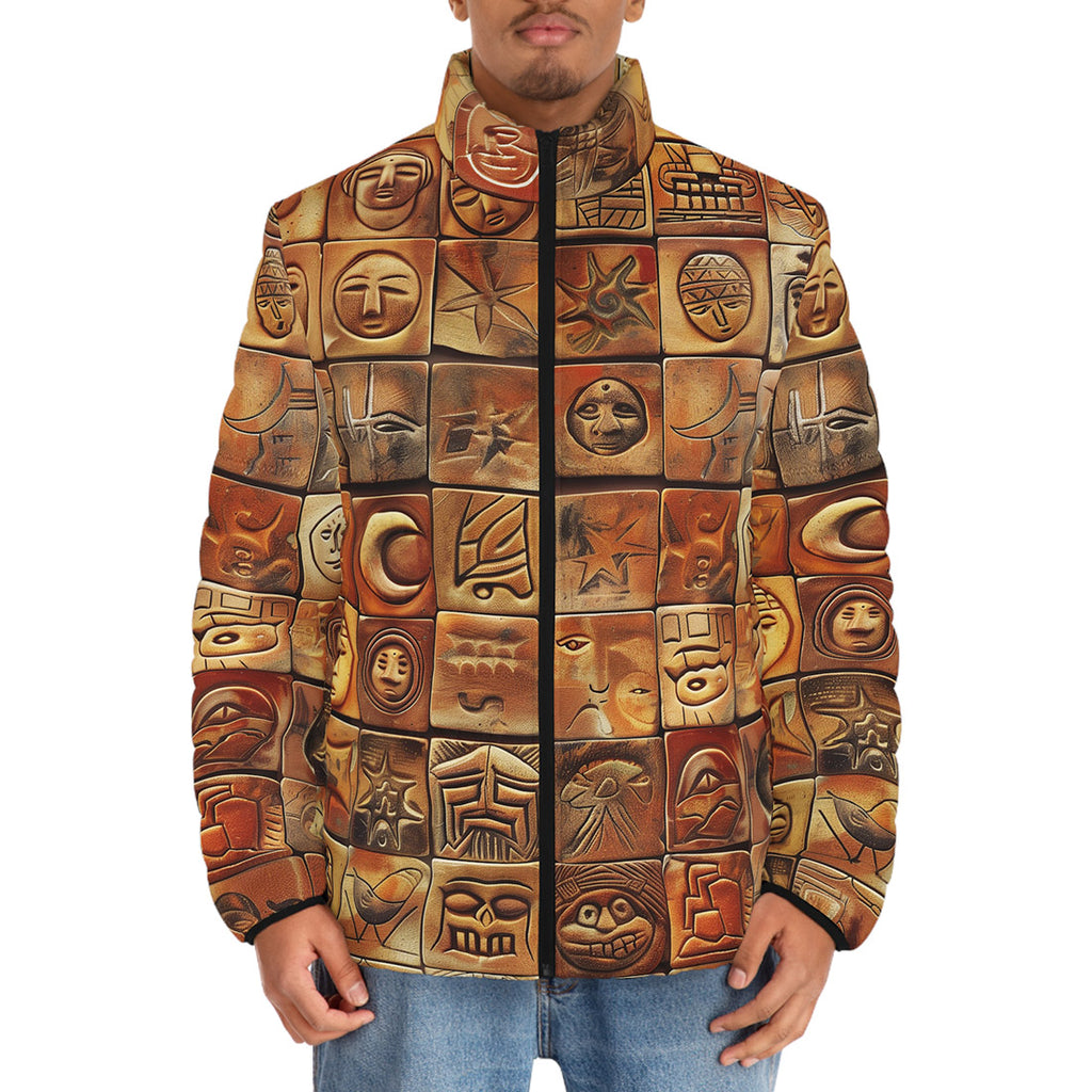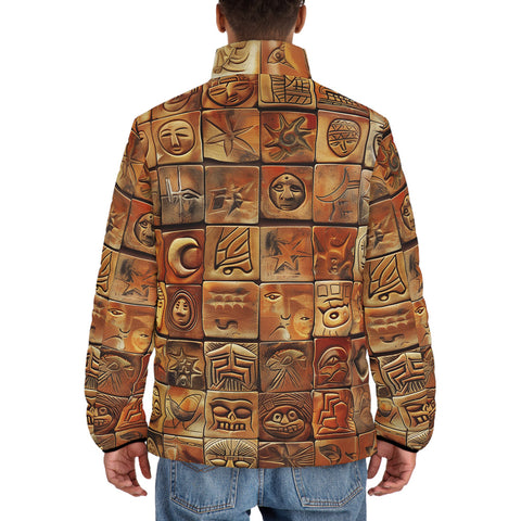 Down-Padded Puffer Jacket Terracotta Tiles Tribal Symbols