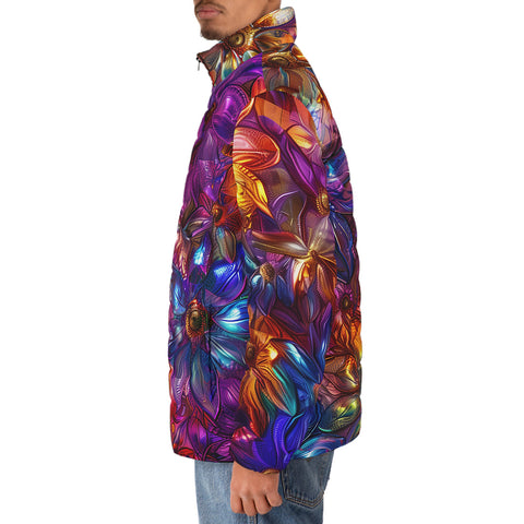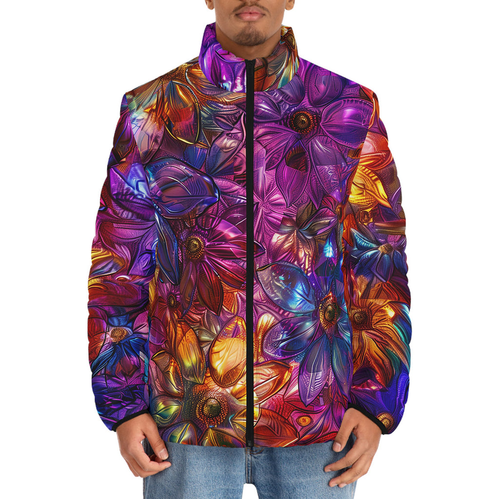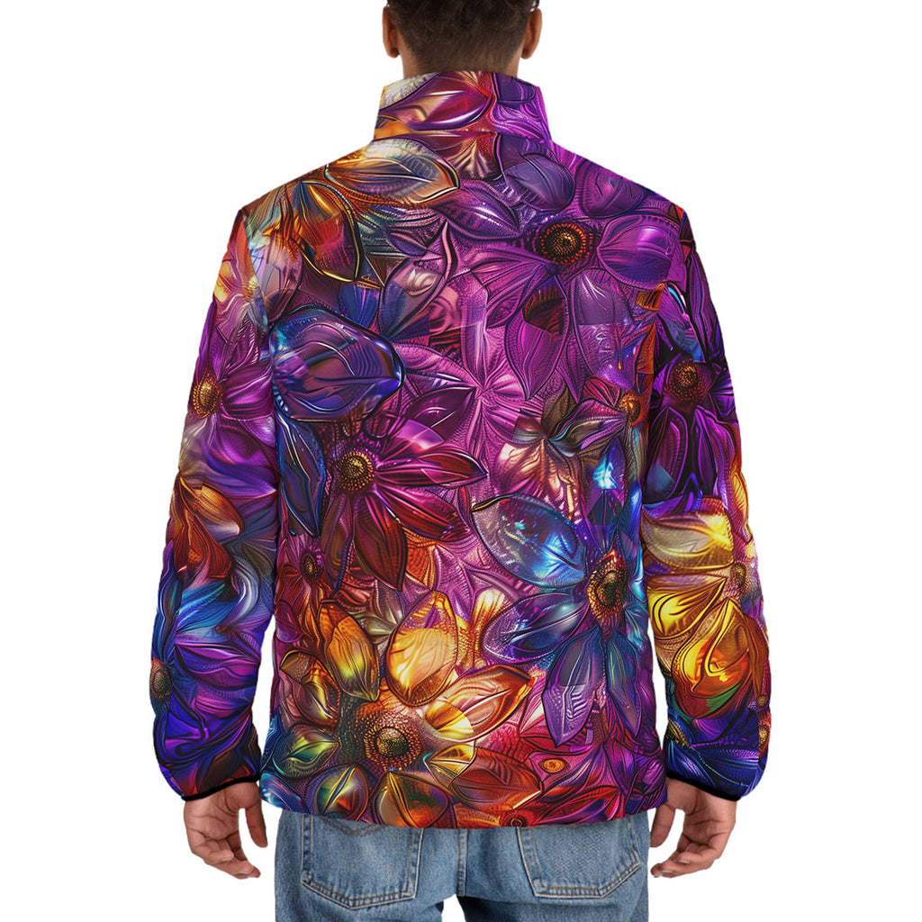 Down-Padded Puffer Jacket Vibrant Pattern of Crystal Flowers