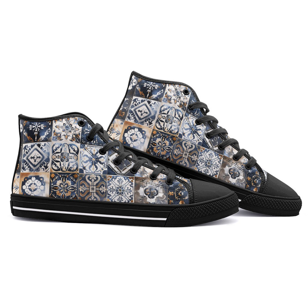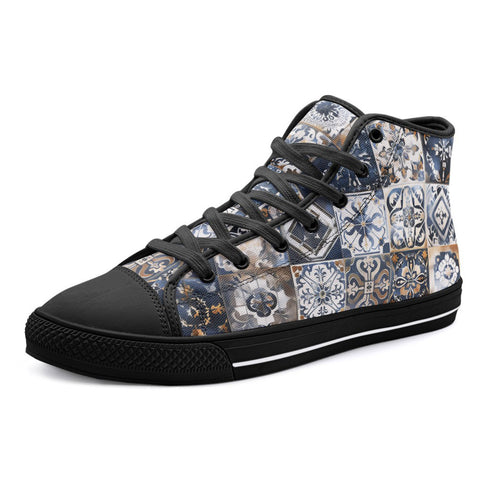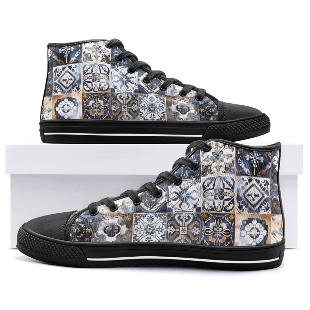 High-Top Canvas Shoes Blue and White Patchwork Tiles