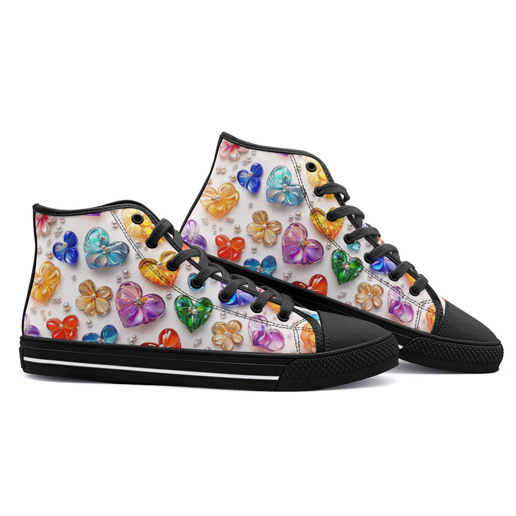 High-Top Canvas Shoes Colorful Glass Hearts and Flowers