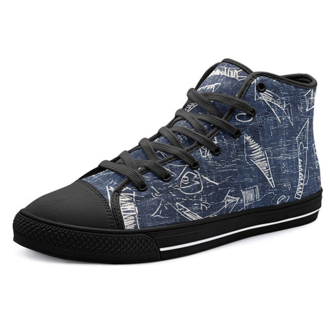 High-Top Canvas Shoes Navy Blue Denim Fabric White Doodles