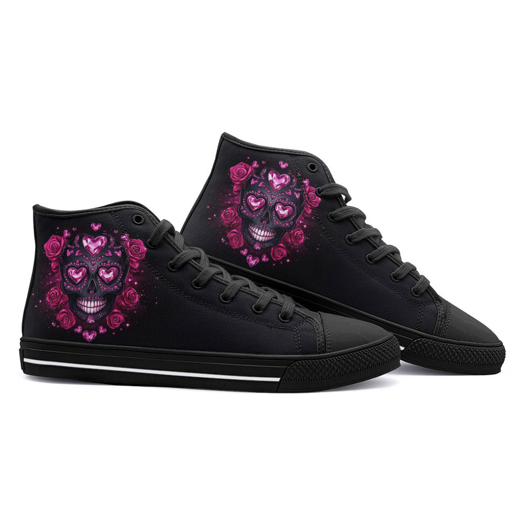 High-Top Canvas Shoes Pink Skull with Heart-Shaped Diamonds