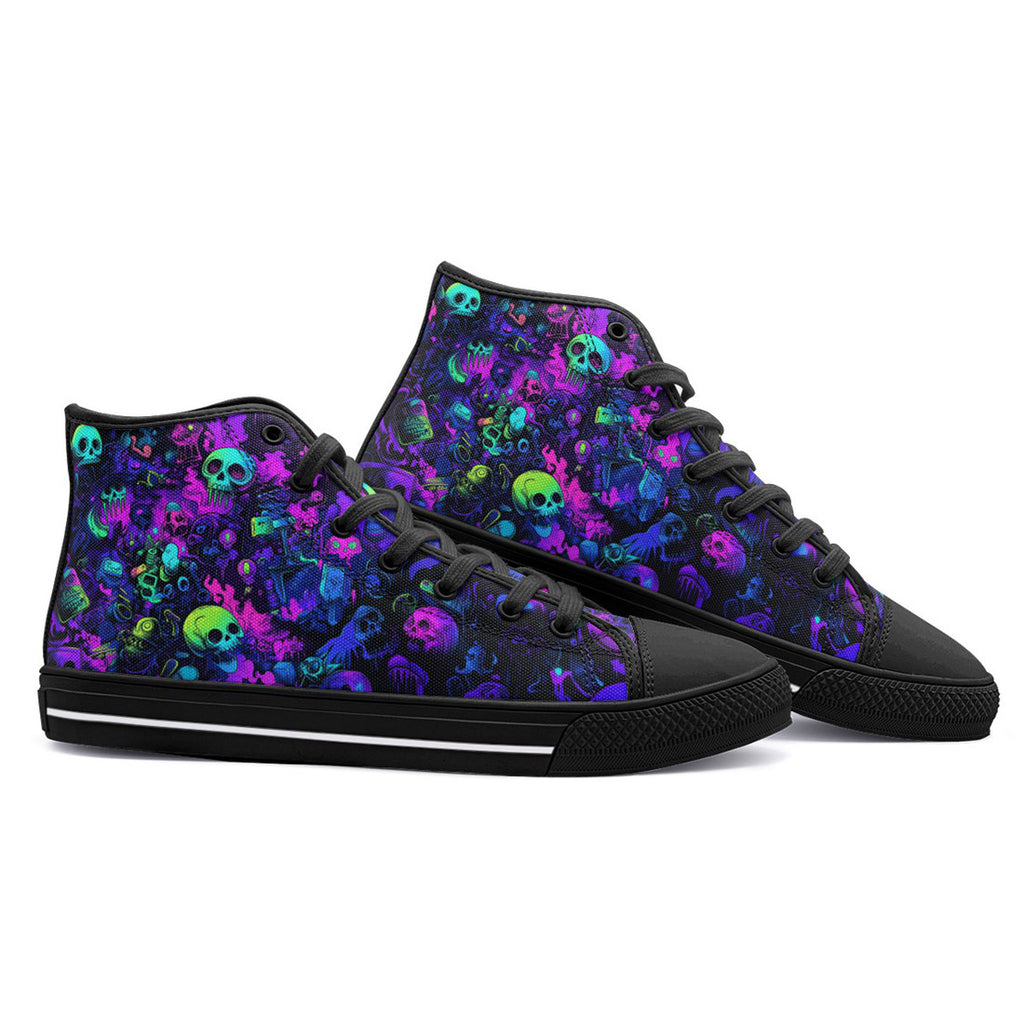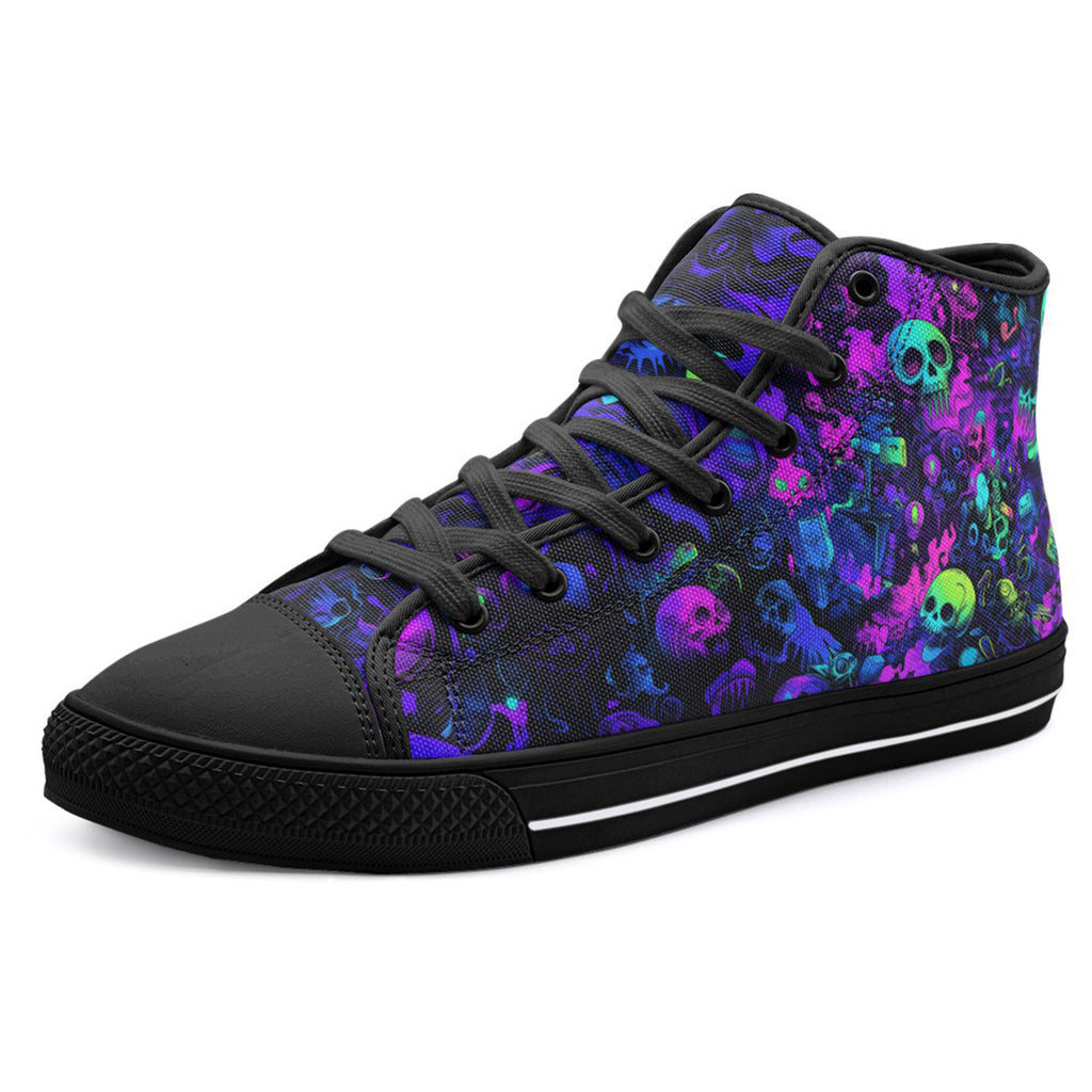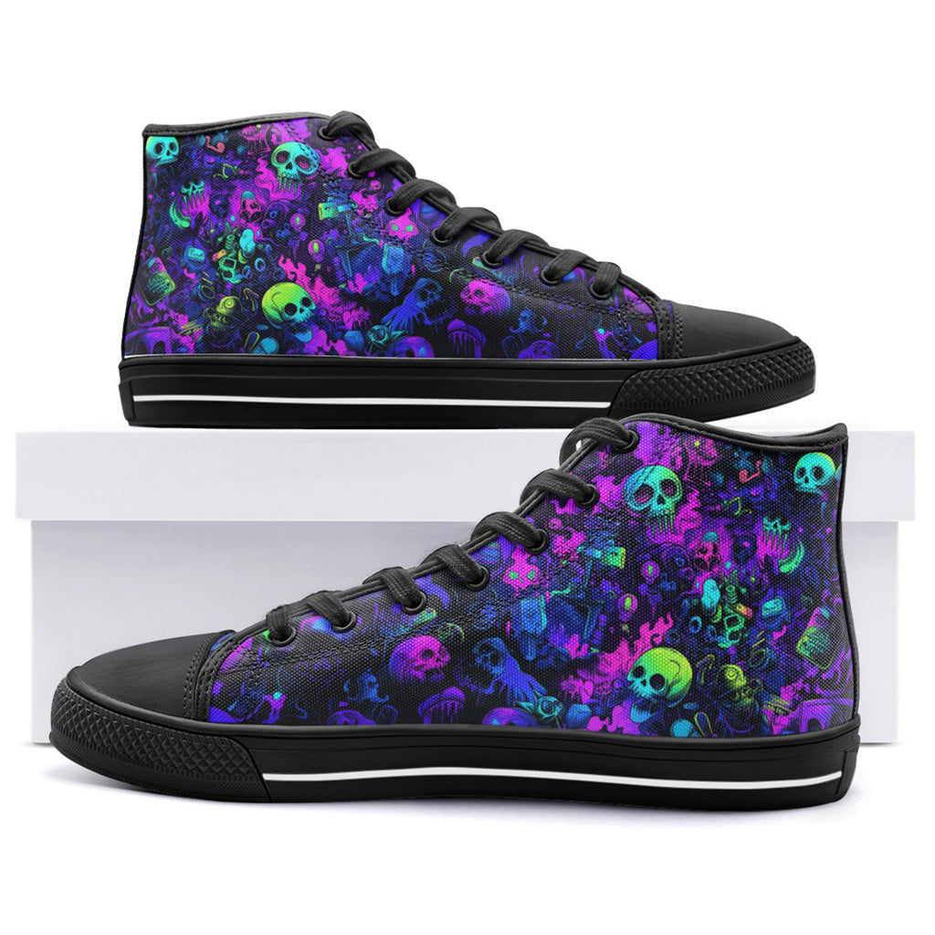 High-Top Canvas Shoes Vibrant Pattern of Neon Skulls