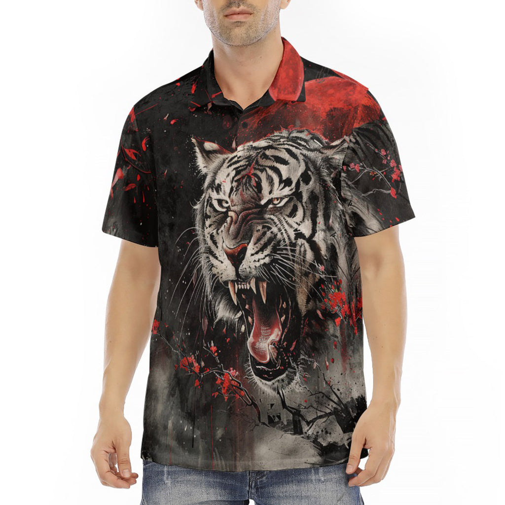 Men's Polo Shirt Angry Tiger Roaring in Dark Jungle