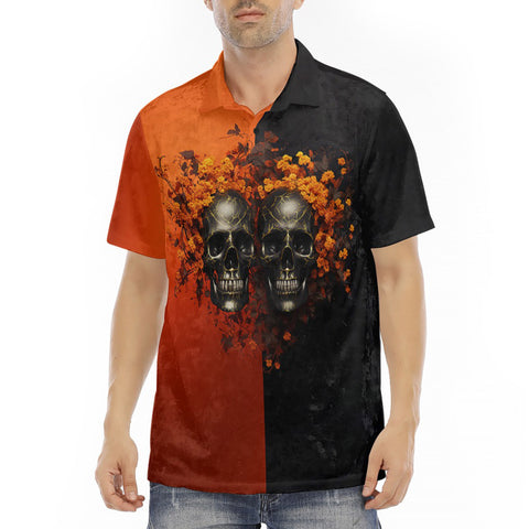 Men's Polo Shirt Skulls and Flowers Red and Black