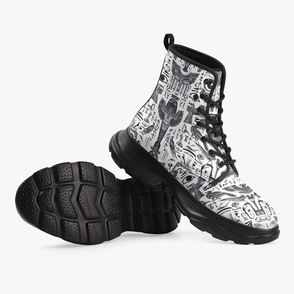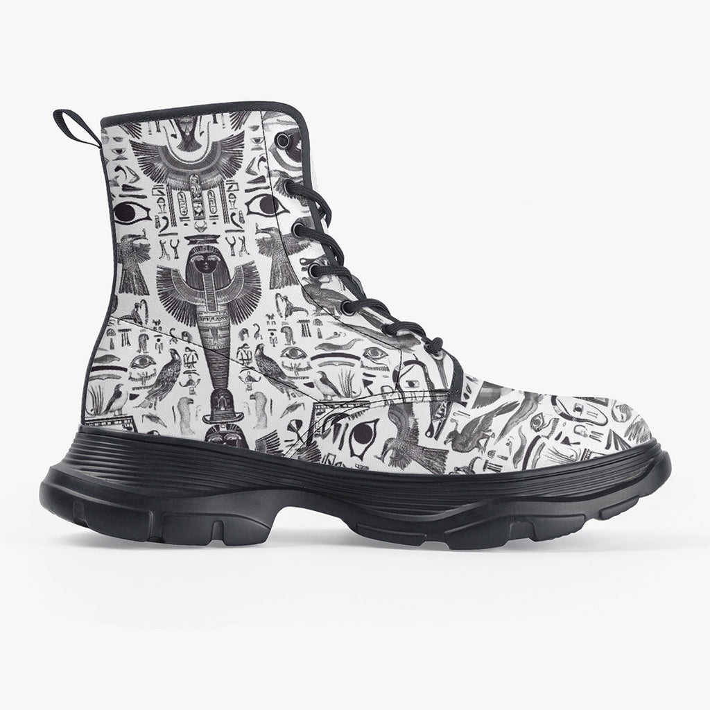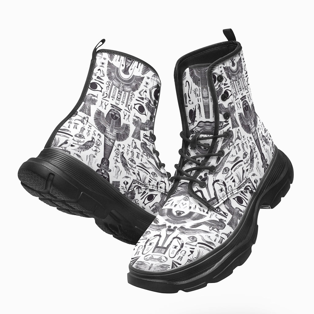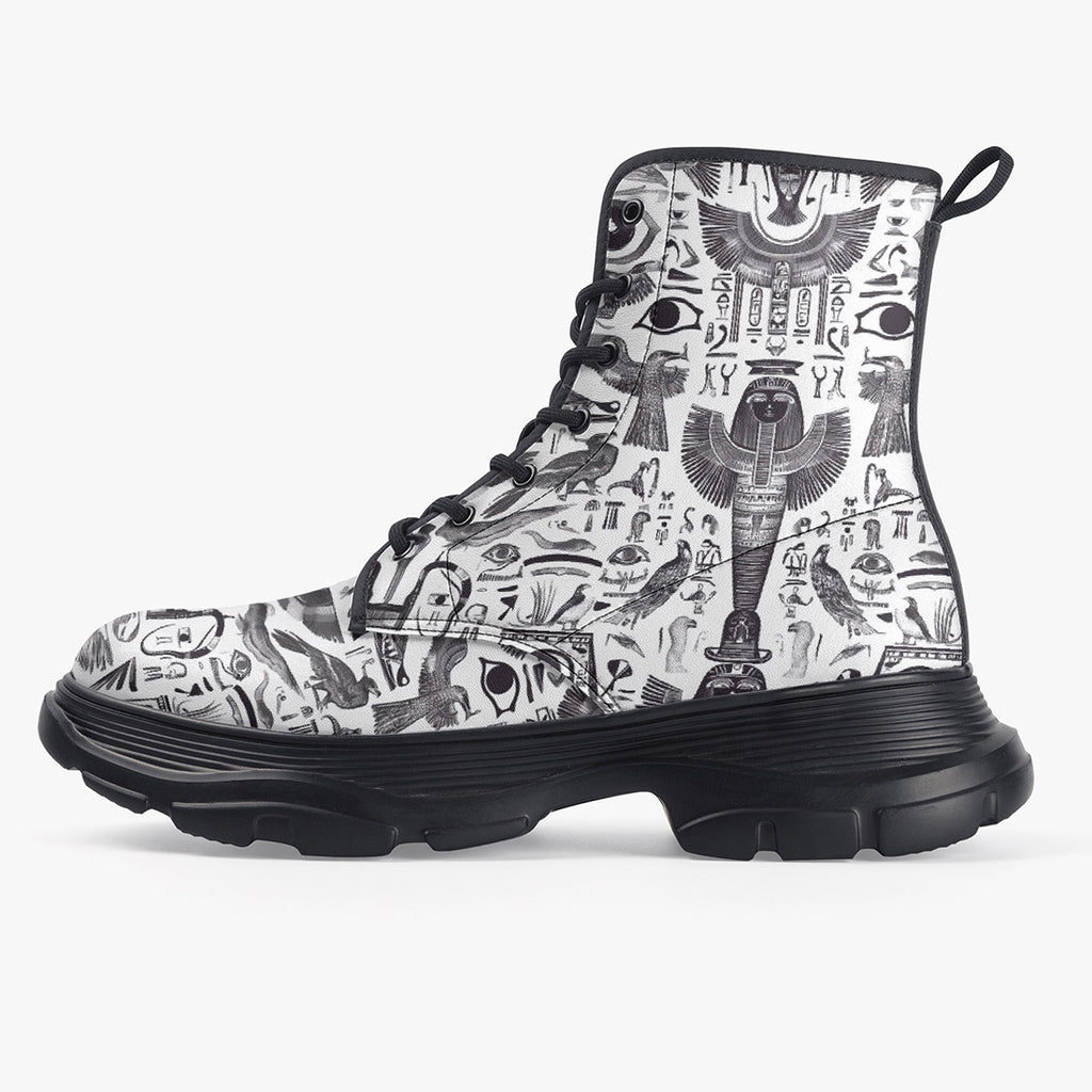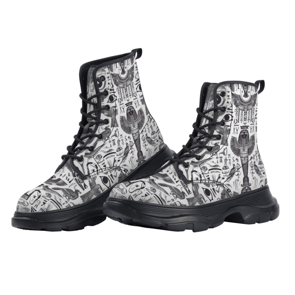 PU Leather Chunky Boots Ancient Egyptian Symbols and Elements
