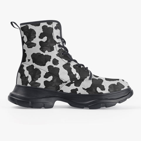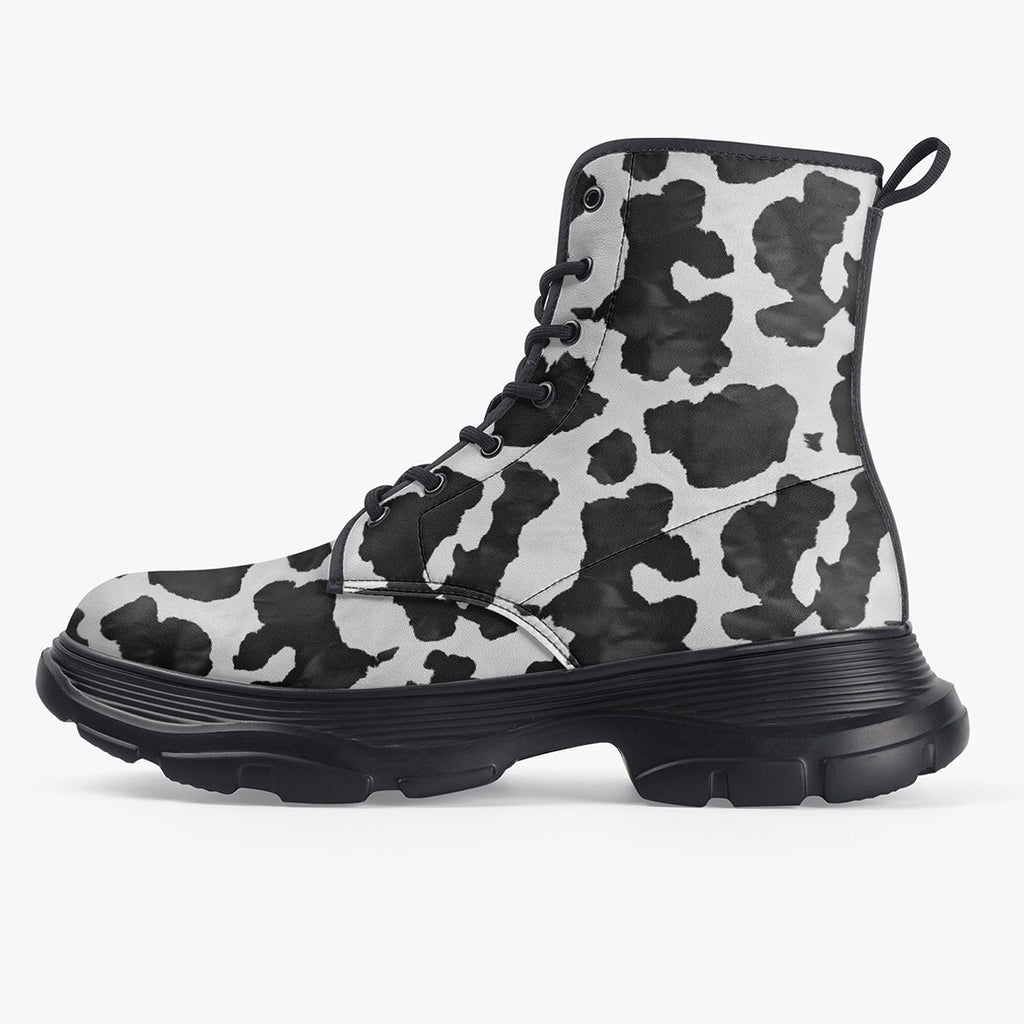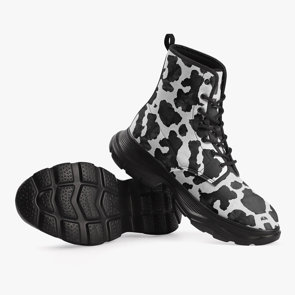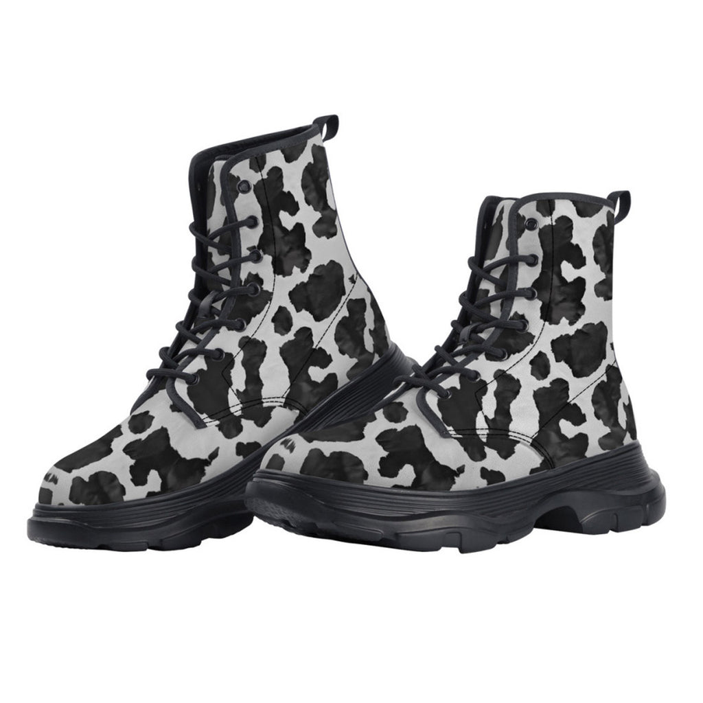 PU Leather Chunky Boots Black and White Cow Print Pattern