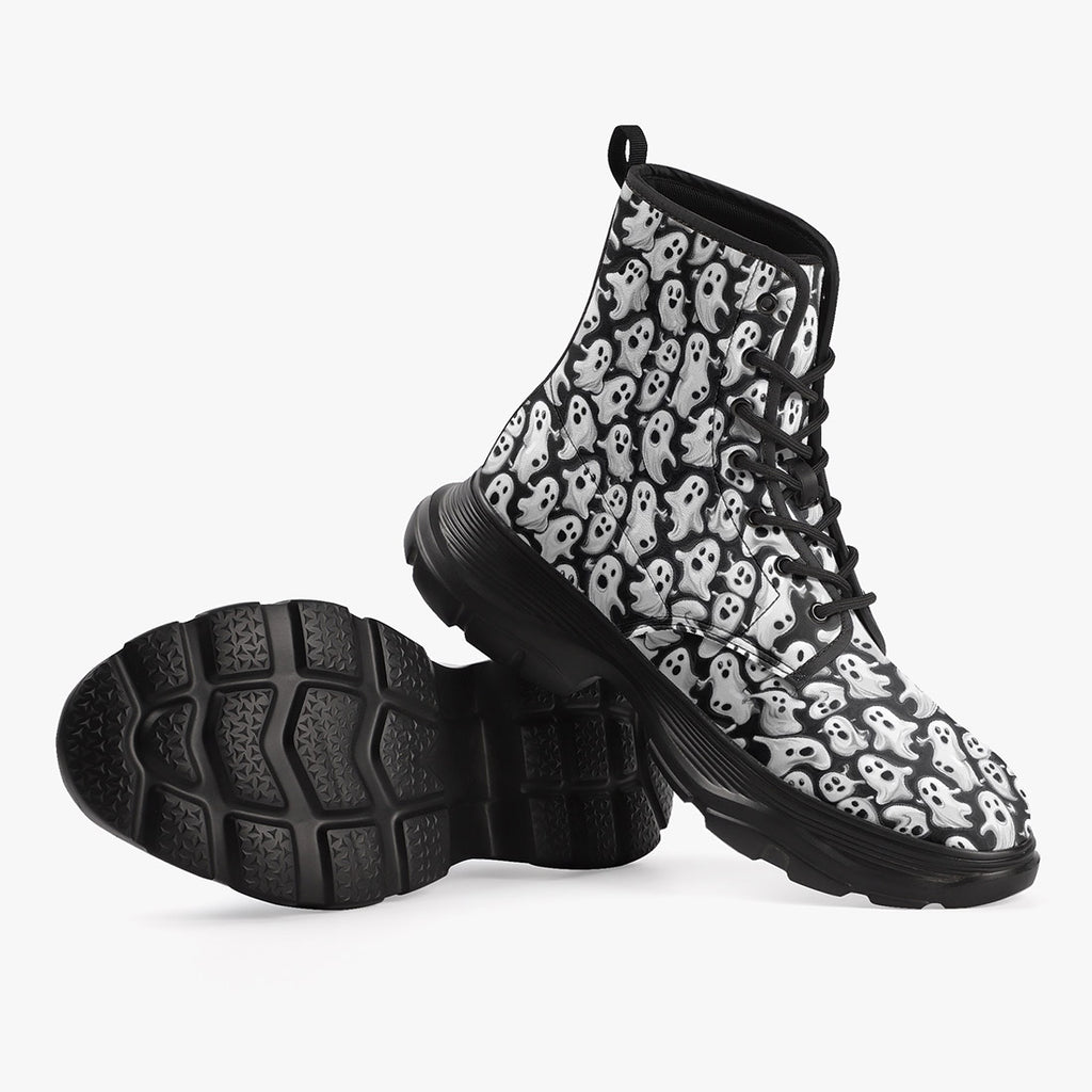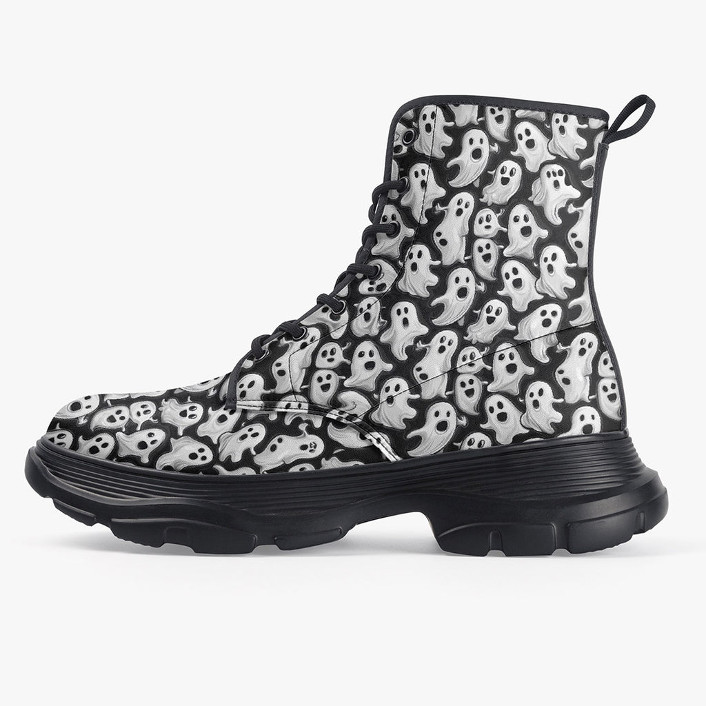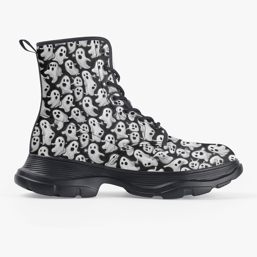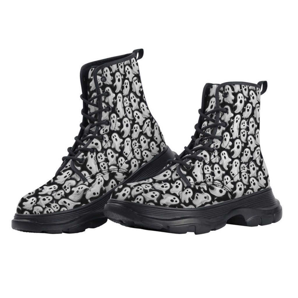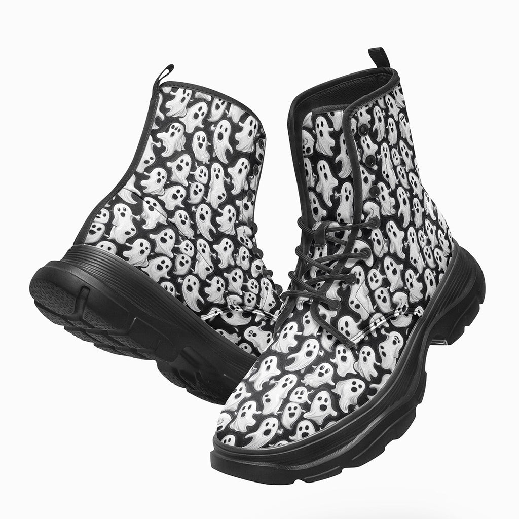 PU Leather Chunky Boots Cartoon Ghosts Pattern