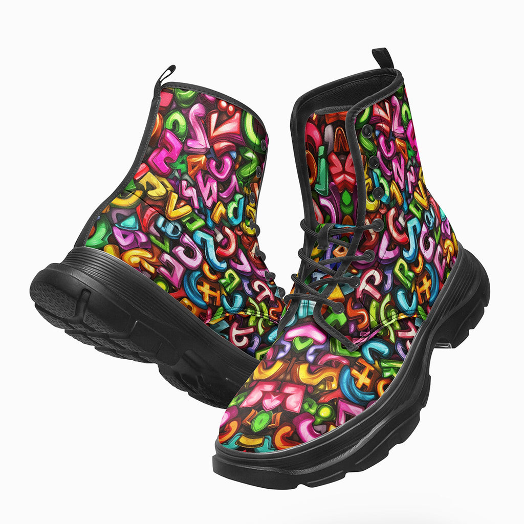 PU Leather Chunky Boots Colorful Graffiti Letters