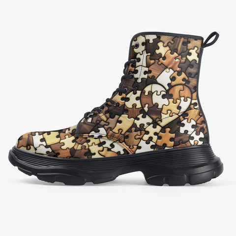 PU Leather Chunky Boots Heart Shaped Wooden Puzzle