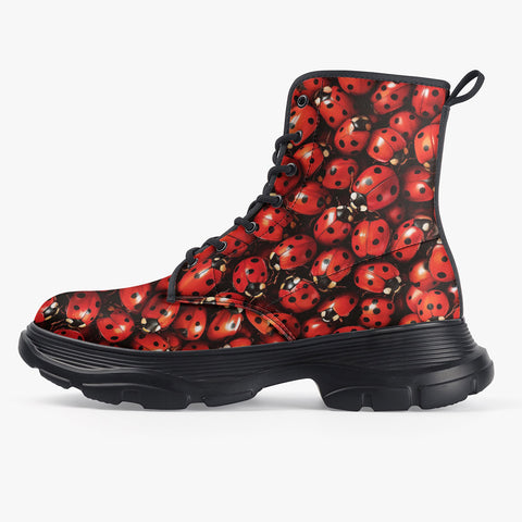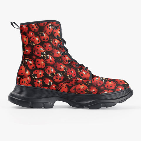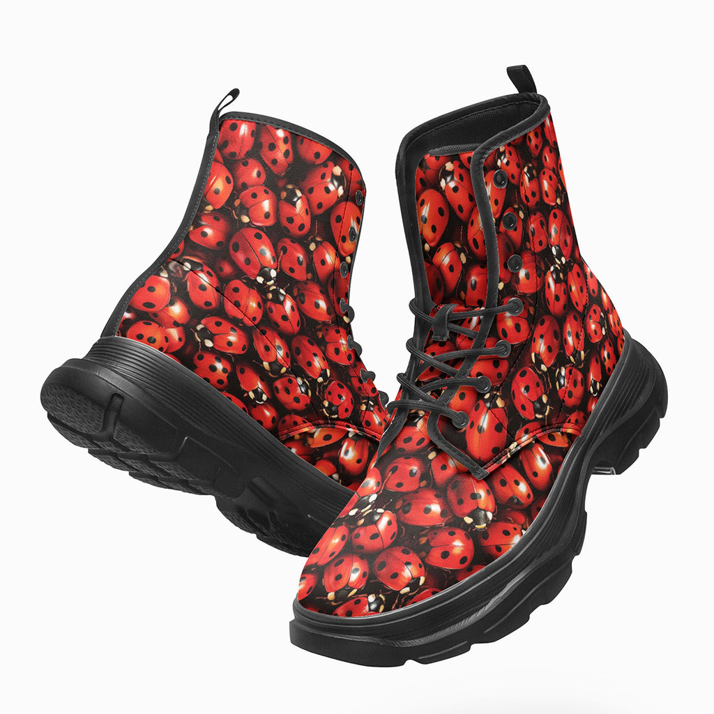 PU Leather Chunky Boots Ladybugs Print Pattern