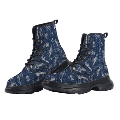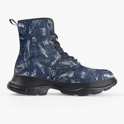 PU Leather Chunky Boots Navy Blue Denim Fabric White Doodles