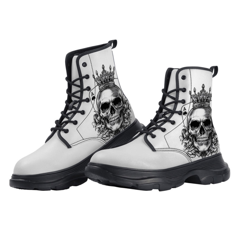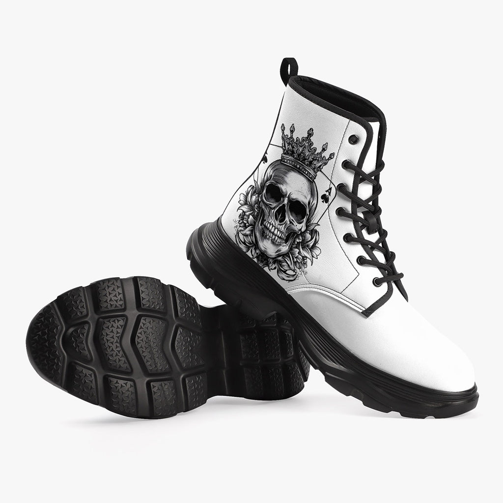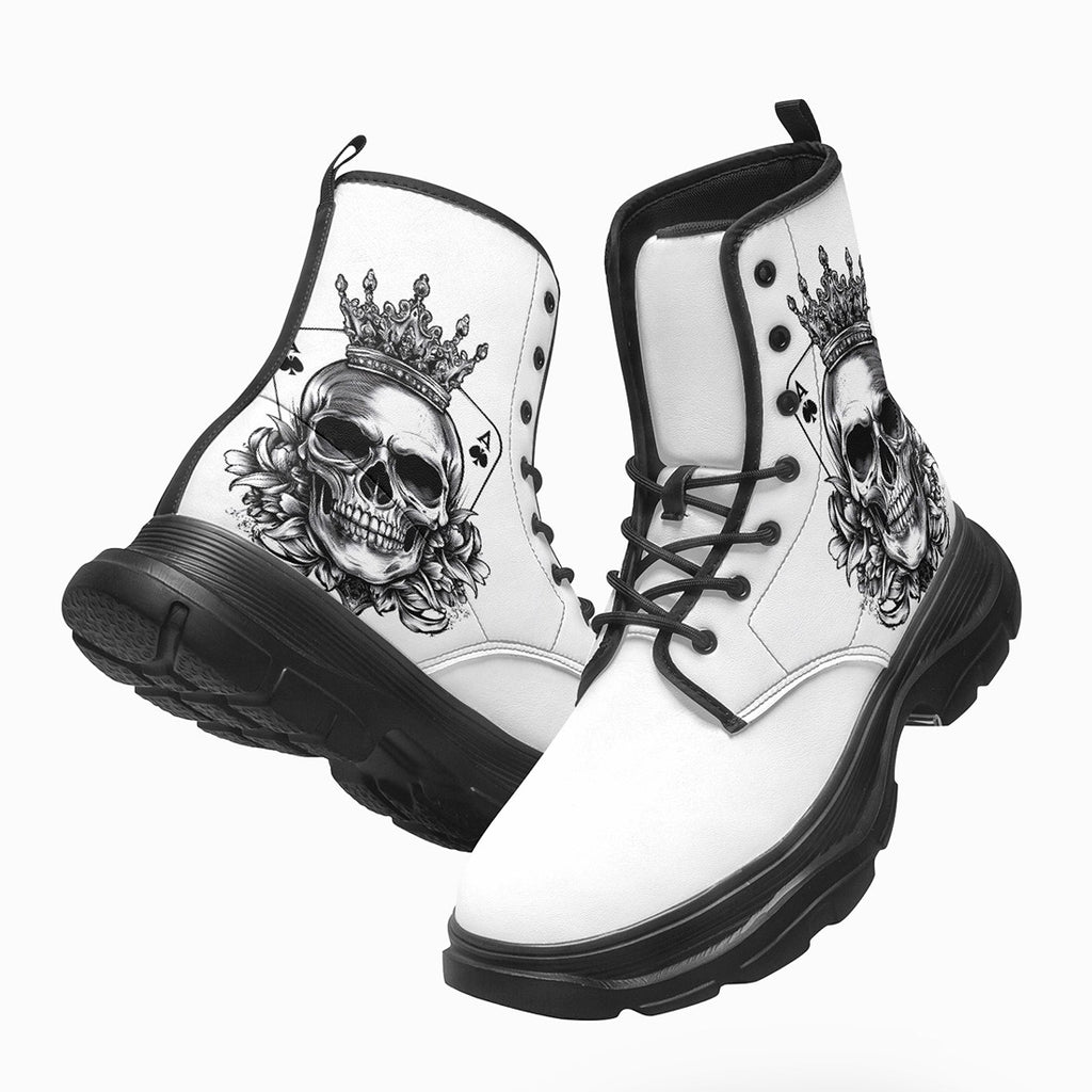 PU Leather Chunky Boots Skull with Crown and Playing Cards