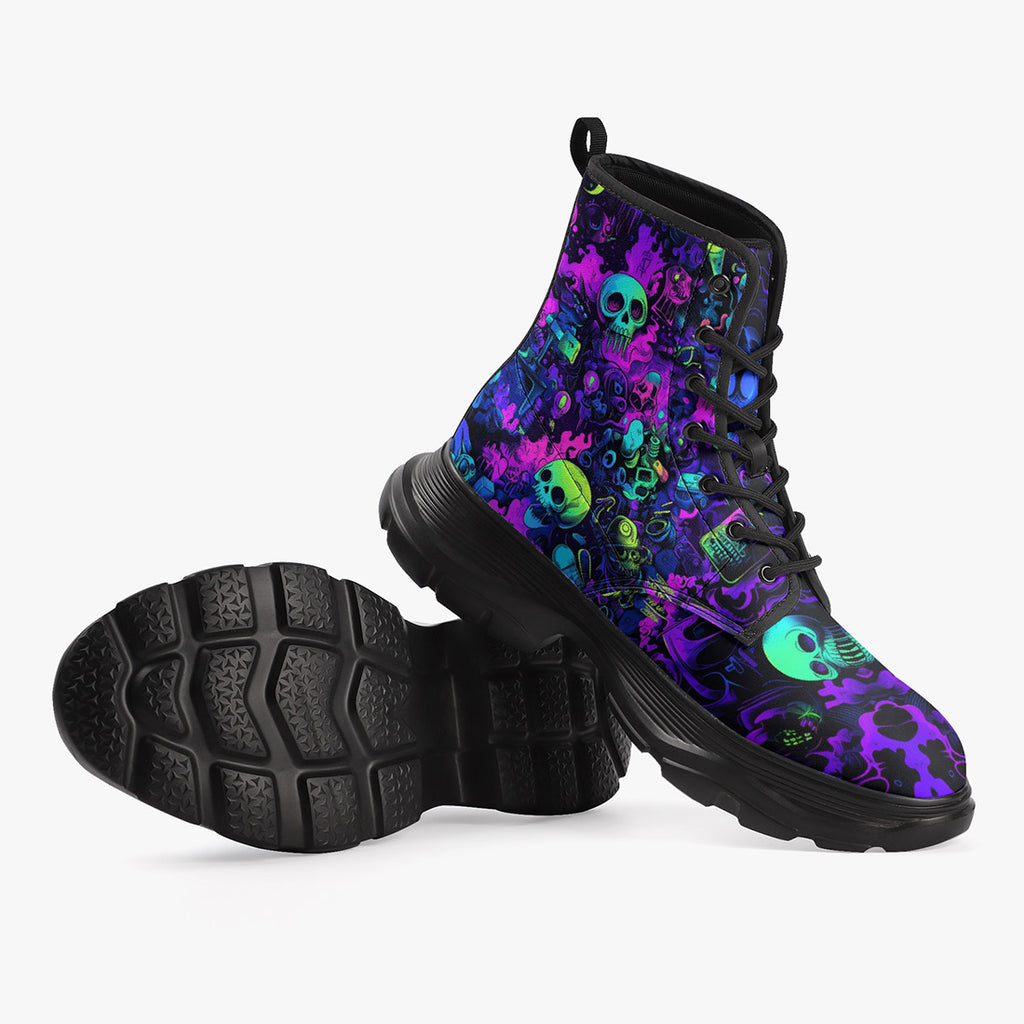 PU Leather Chunky Boots Vibrant Pattern of Neon Skulls