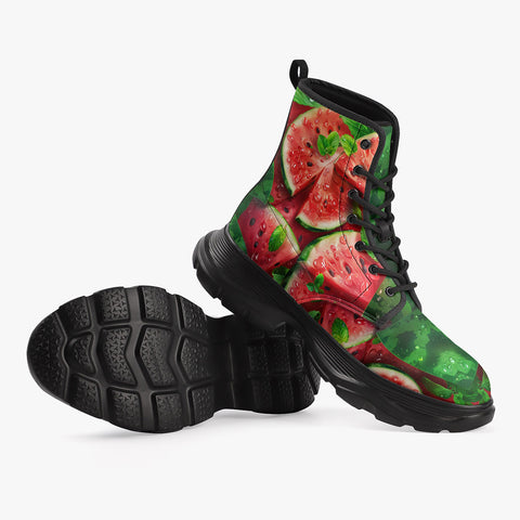 PU Leather Chunky Boots Watermelon Slices with Green Leaves